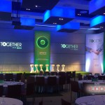 Luces azules y verdes ajustadas al branding, moqueta de césped artificial y equipo de sonido.