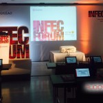Pantalla de proyección encastrada en trasera de vinilo, tira de led blanca para iluminar la cartelería, iluminación con PAR Led y recortes, equipo de sonido para conferencias.