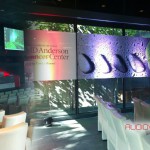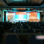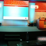 Iluminación corporativa, pantallas de plasma de apoyo para el público, sonido y atril con frontal de cartón pluma.