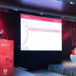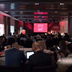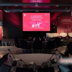Pantalla led de interior, iluminación decorativa de led, y micrófonos de petición de palabra para el público.